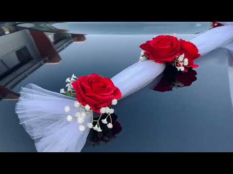 Die AMBER Hochzeitsautodekoration besticht durch ihre harmonische Komposition aus strahlend roten Rosen und zarten weißen Tüllelementen - eine klassische Farbkombination, die für Liebe und Reinheit steht, ein Klassiker des Hochzeitdesigns. Die elegante Anordnung der Blumengestecke, verbunden durch ein durchgehendes weißes Tüllband, kreiert eine fließende, anmutige Gesamtkomposition.