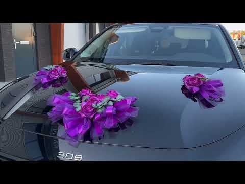 Die INGE Hochzeitsautodekoration überzeugt durch ihr zierliches, herzförmiges Hauptgesteck aus sechs lilafarbenen Rosen als zentrales Element auf der Motorhaube. Üppige grüne Blätter umrahmen die Blüten auf natürliche Weise, während kunstvolle Schleifen aus lilafarbenem Satinband und Tüll das Arrangement nach unten hin veredeln. Zwei weitere elegante Gestecke, die seitlich im oberen Bereich der Motorhaube platziert sind, komplettieren das Gesamtbild. Jedes dieser Seitengestecke besteht aus drei lilafarbenen Rosen, die von frischen grünen Blättern umspielt und von einer Schleife aus lilafarbenem Satinband und Tüll gekrönt werden. Diese durchdachte Anordnung schafft eine perfekte Balance zwischen verspielter Romantik und edler Eleganz.