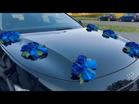 Die MARTINA Hochzeitsautodekoration überzeugt durch ihre einzigartige V-förmige Komposition aus sechs einzelnen Rosengestecken auf der Motorhaube. Jedes dieser kunstvoll arrangierten Gestecke besteht aus drei blauen Rosen, die von frischen grünen Blättern als Basis umrahmt werden. Eine elegante Schleife aus blauen Satinband und Tüll verleiht jedem Gesteck einen festlichen Akzent. Die symmetrische Anordnung von je drei Gestecken auf jeder Seite kreiert eine perfekte Balance zwischen floraler Fülle und klarer Formensprache.